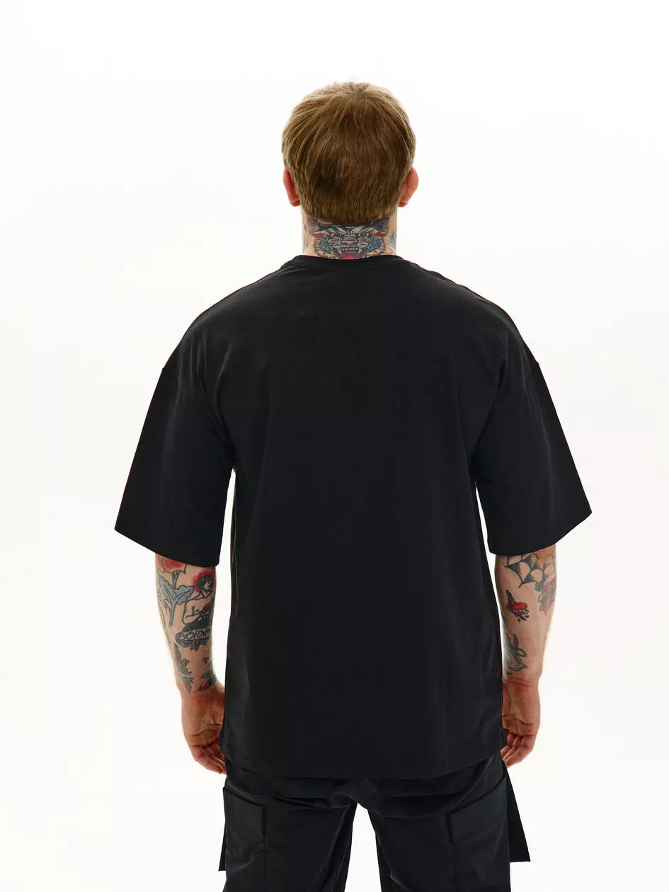 Футболка вільного крою з круглим коміром і подовженими рукавами. На