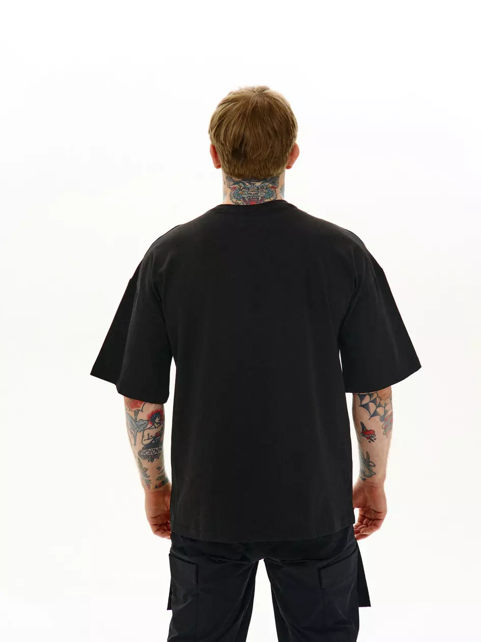 Футболка вільного крою з круглим коміром і подовженими рукавами.