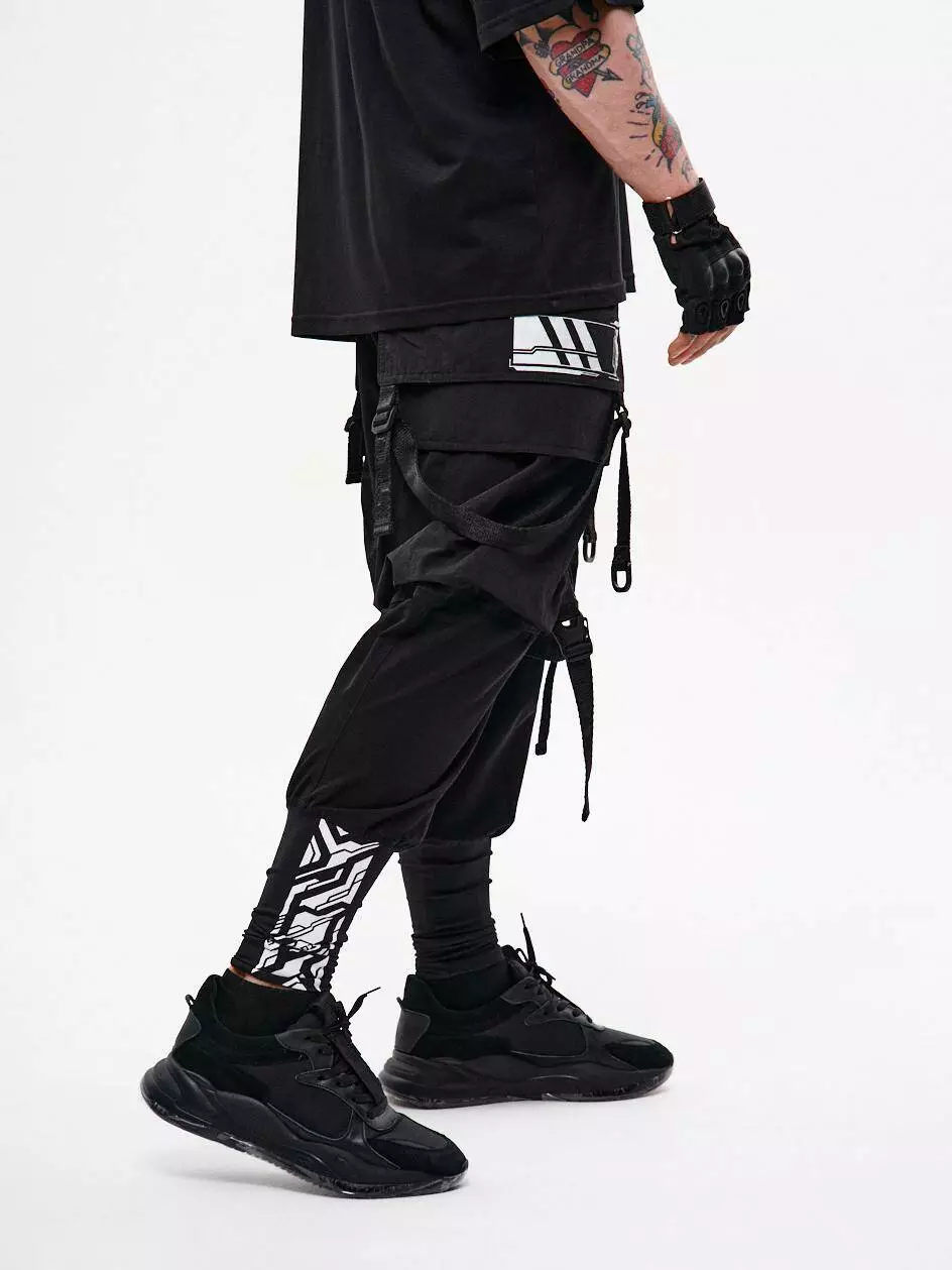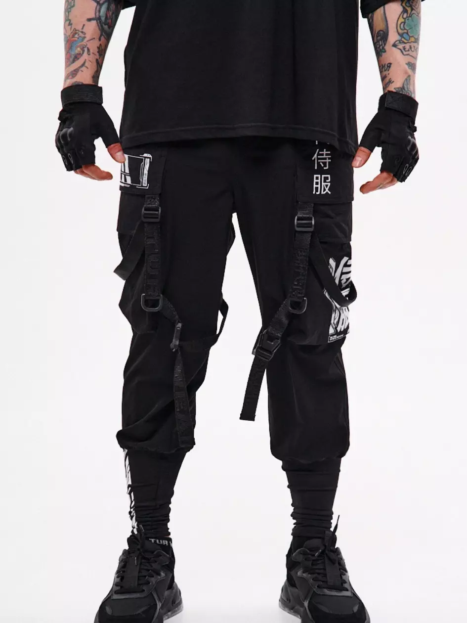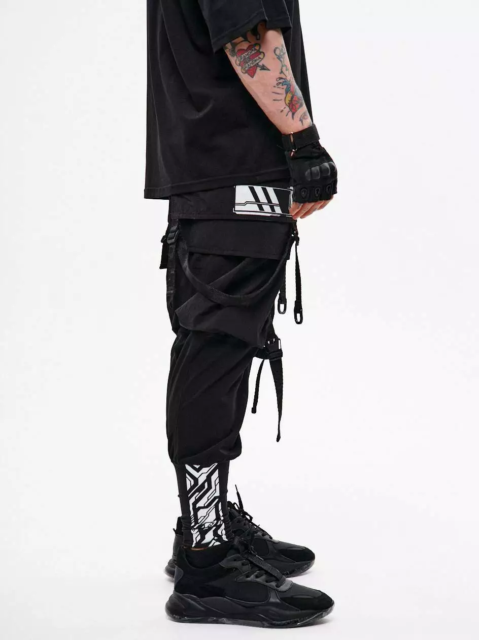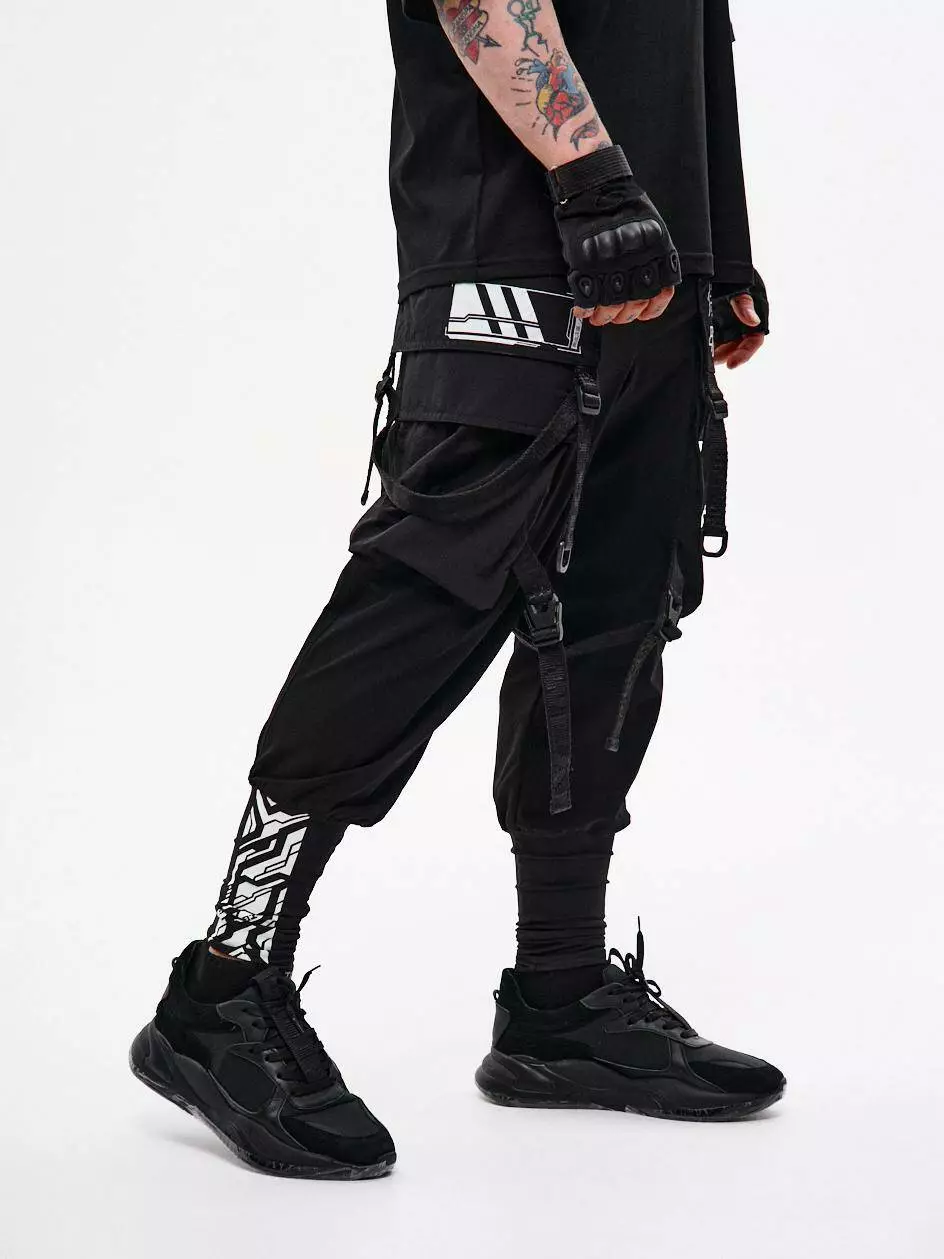Штани-карго вільного крою з високими манжетами з щільного еластичного нейлону. На правій манжеті розміщено принт. Шість накладних кишень, зокрема верхні — відлітні, перекривають частину клапанів бокових кишень, створюючи ефект багатошаровості. Декор у вигляді строп з фастексами на колінах дозволяє регулювати ширину штанин. Стропи, що з'єднують кути верхніх кишень, завершуються напівкільцями — можна кріпити підсумки чи брелоки. Ще одне напівкільце інтегроване в передню шлівку. Штани мають шлівки під пасок і внутрішню резинку для комфортної посадки. Застібка — гульфик на кнопку. Чотири принти в стилі кіберпанк підкреслюють характер моделі. Бокові кишені побудовані за принципом штанів Кібер.