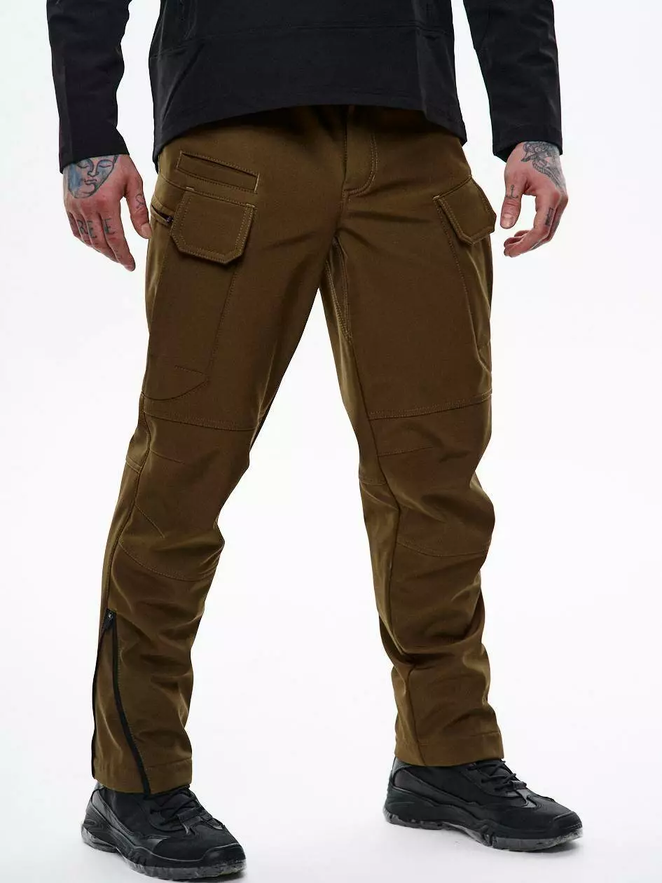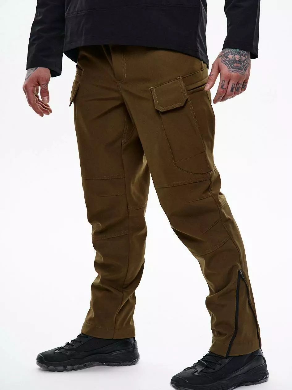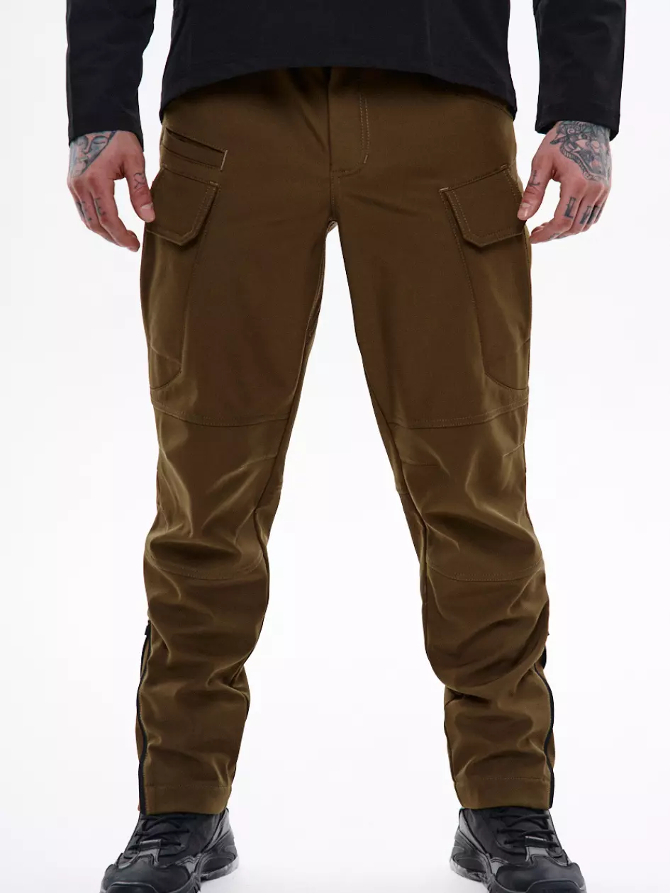 Тактичні карго з софтшелу — водонепроникного матеріалу на основі мікрофлісу, ідеального для холодної осені та початку зими. Температурний комфорт до -20°C. Пояс із резинкою та шлівками під пасок TUR, на правій шлівці — карабін для кріплення рукавиць чи спорядження.