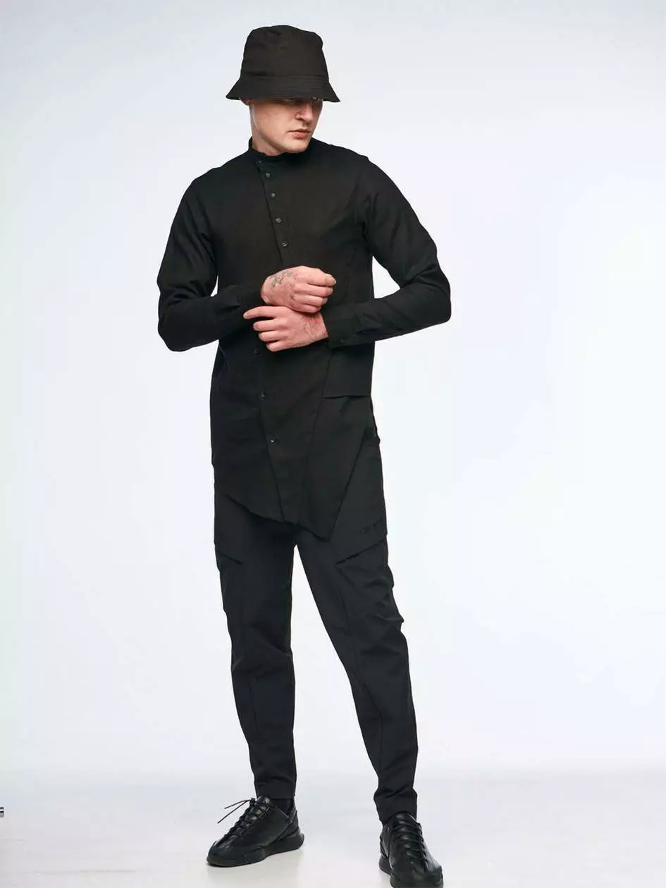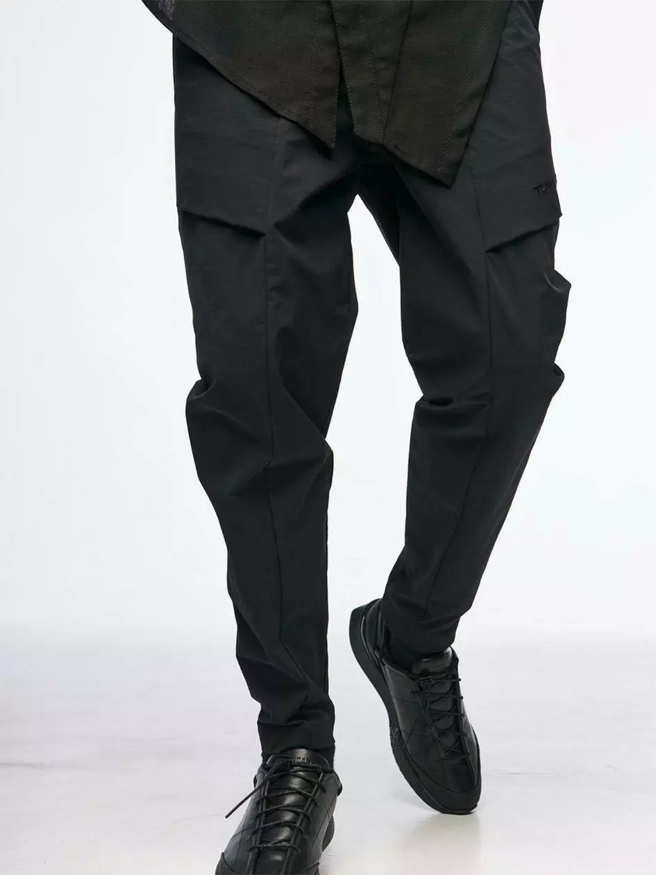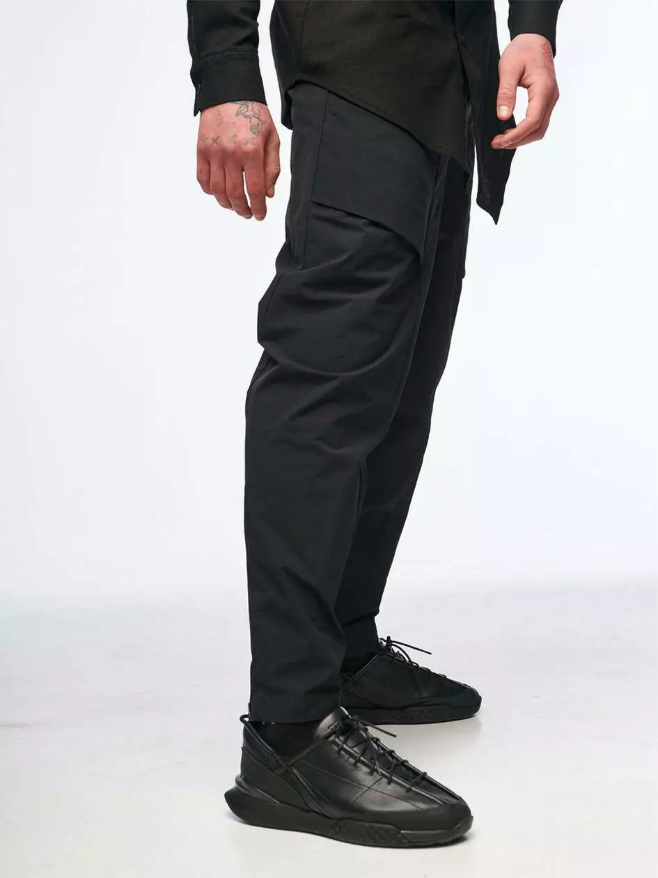 Штани вільної посадки зі звуженими донизу штанинами — ідеальний баланс форми та функціональності. Низ регулюється блискавкою, дозволяючи змінювати силует у залежності від потреб. Пояс класичного типу — на кнопці та блискавці, з можливістю кріплення аксесуарів з правого боку.