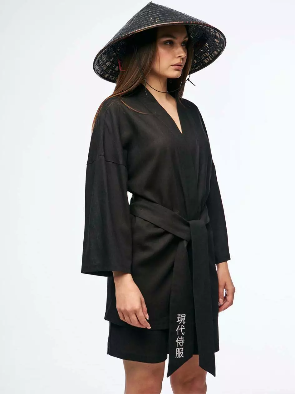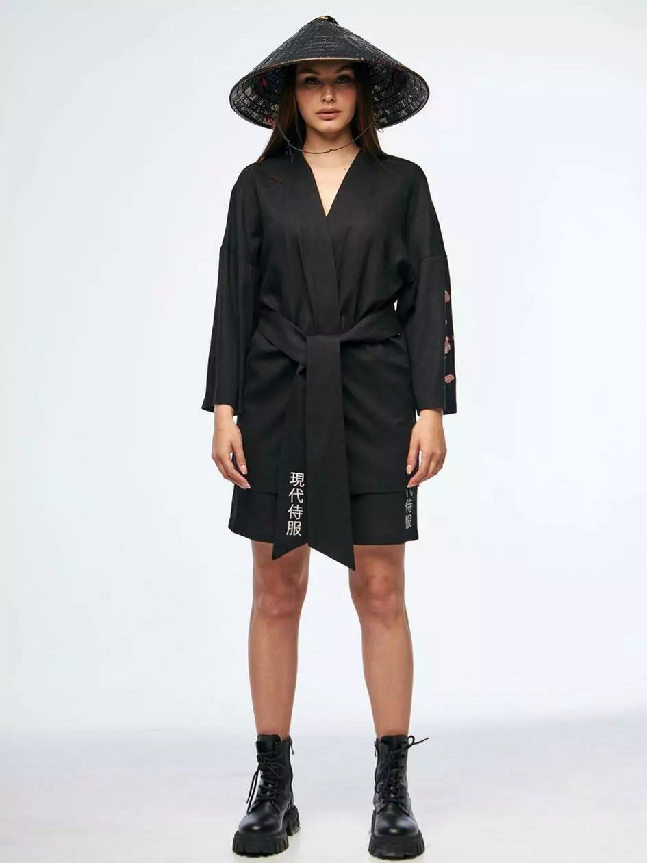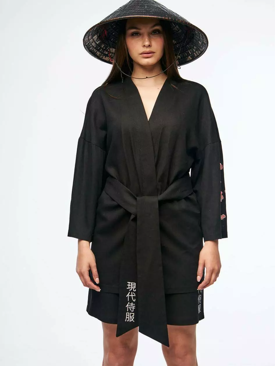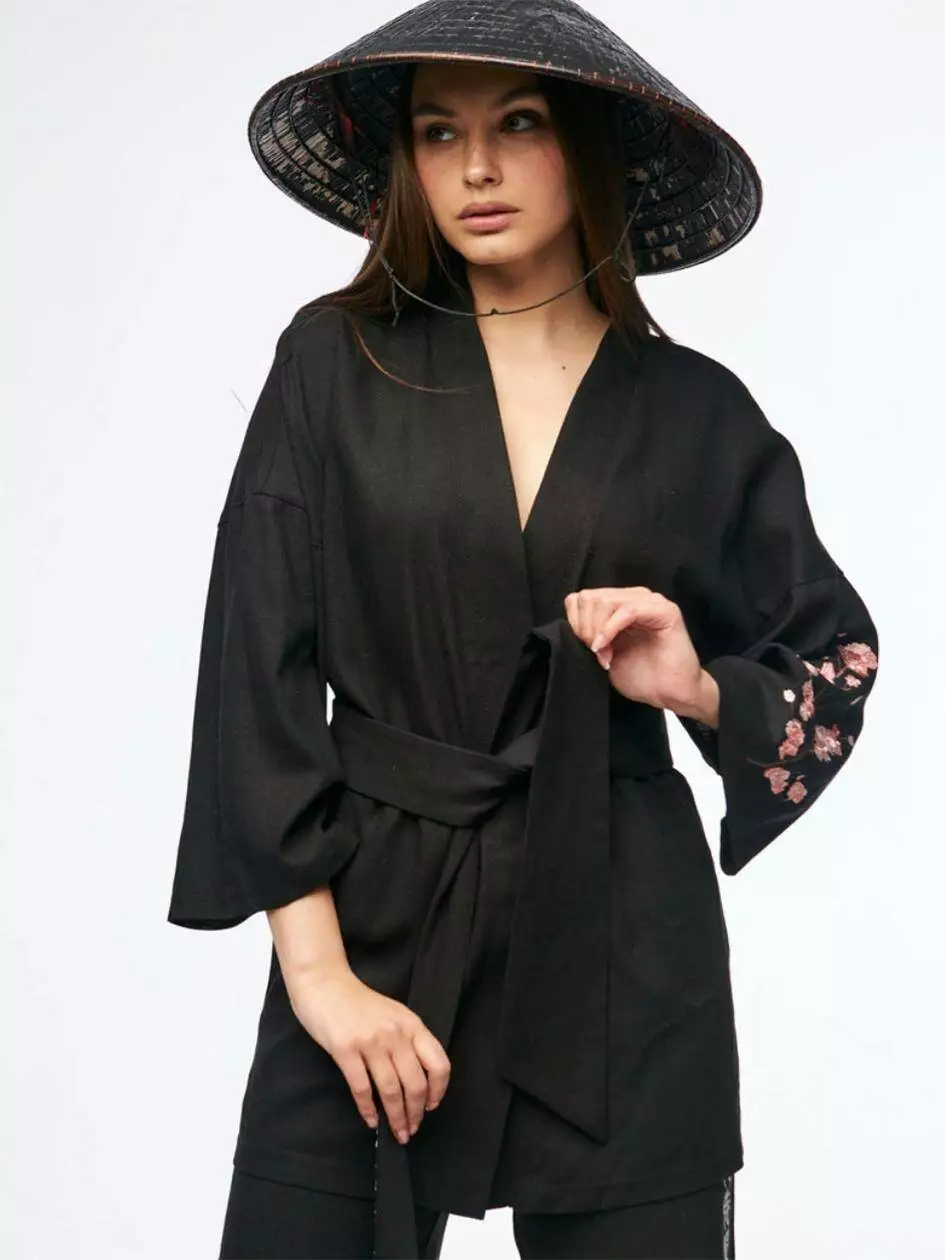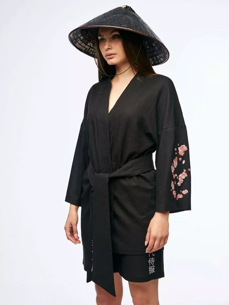 Кімоно вільного крою. На лівому рукаві вишивка сакури. На поясі