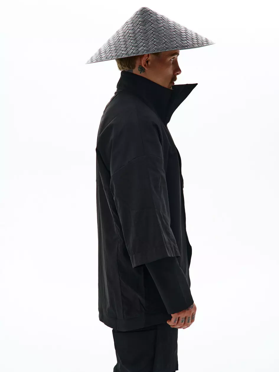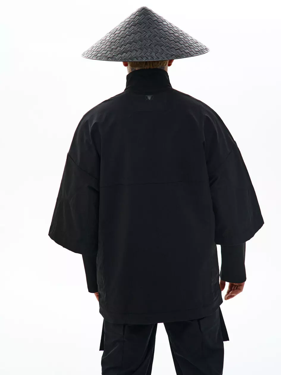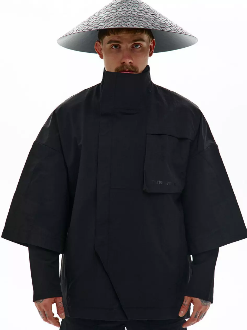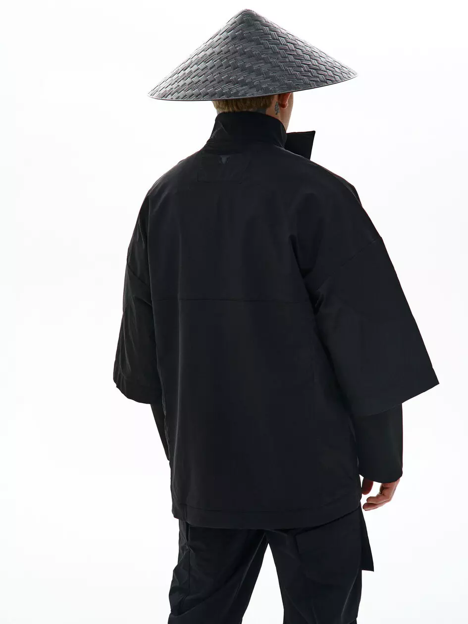 Кімоно з високим коміром-стійкою та асиметричним кроєм. На лівій