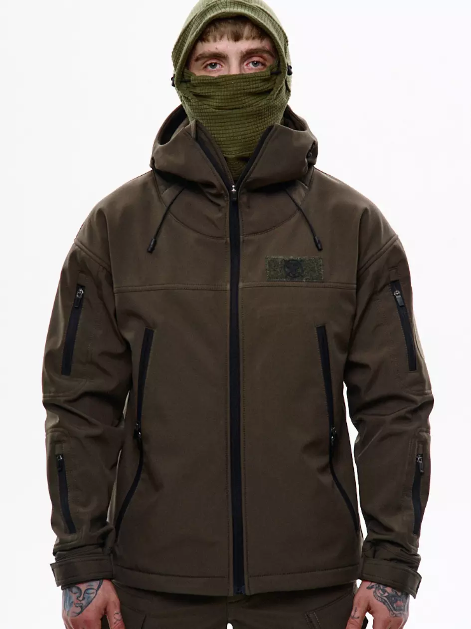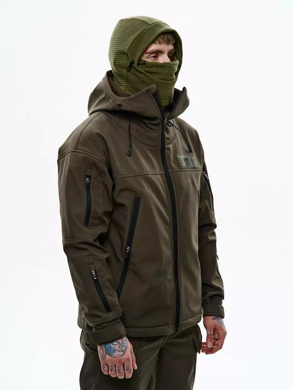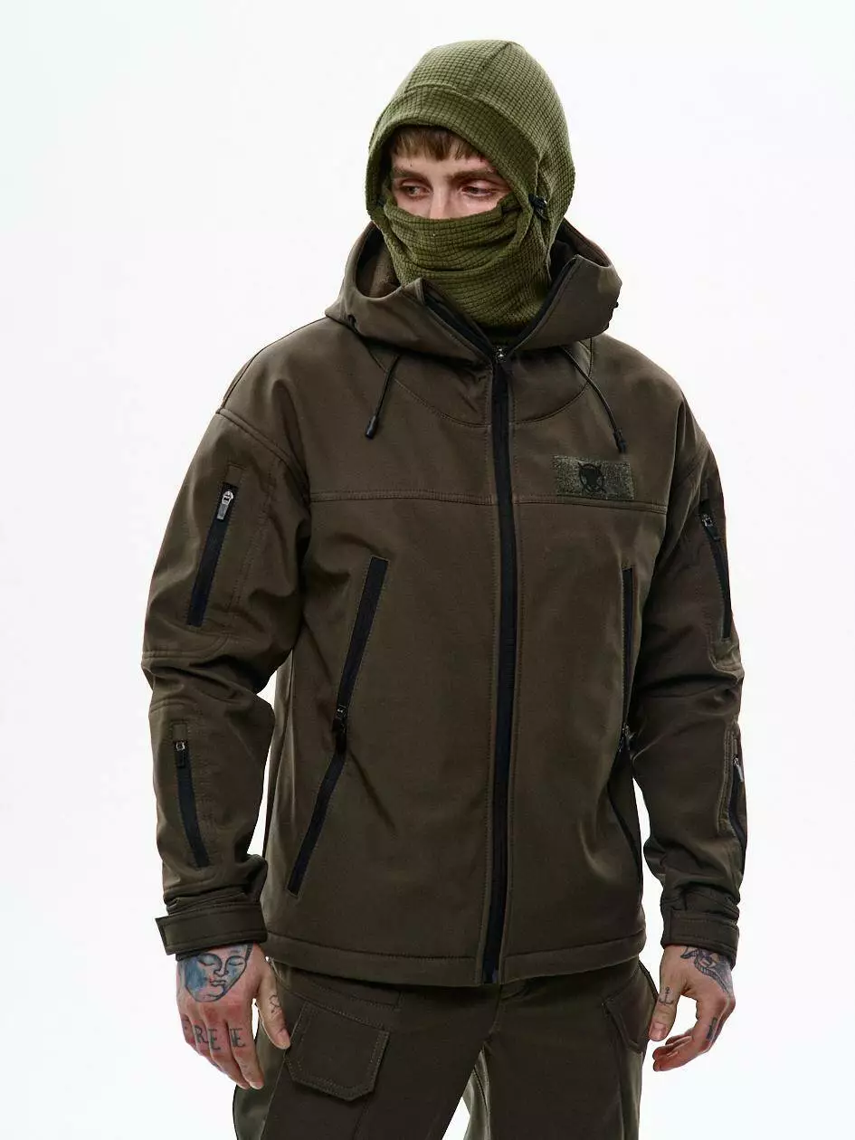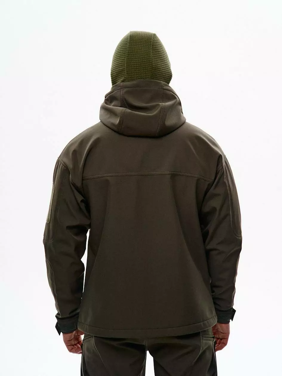 Куртка зі софтшелу стандартного крою з капюшоном, який регулюється по вертикалі. Подвійні нагрудні кишені утеплені мікрофлісом — зігріють у прохолодну погоду. Ідеально підходить для осені та початку зими, комфортна температура до -5°C. Низ регулюється еластичним шнуром. Рукави — з патами на липучках для щільної посадки. На лівій стороні — велкро панель для патчів. На кожному рукаві — по дві кишені на блискавках; на верхній лівій — ще одна велкро панель для шевронів. Всередині — кишеня на блискавці для документів.