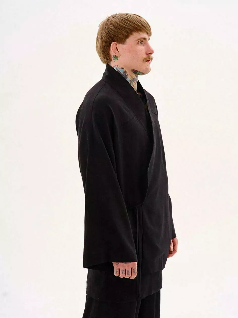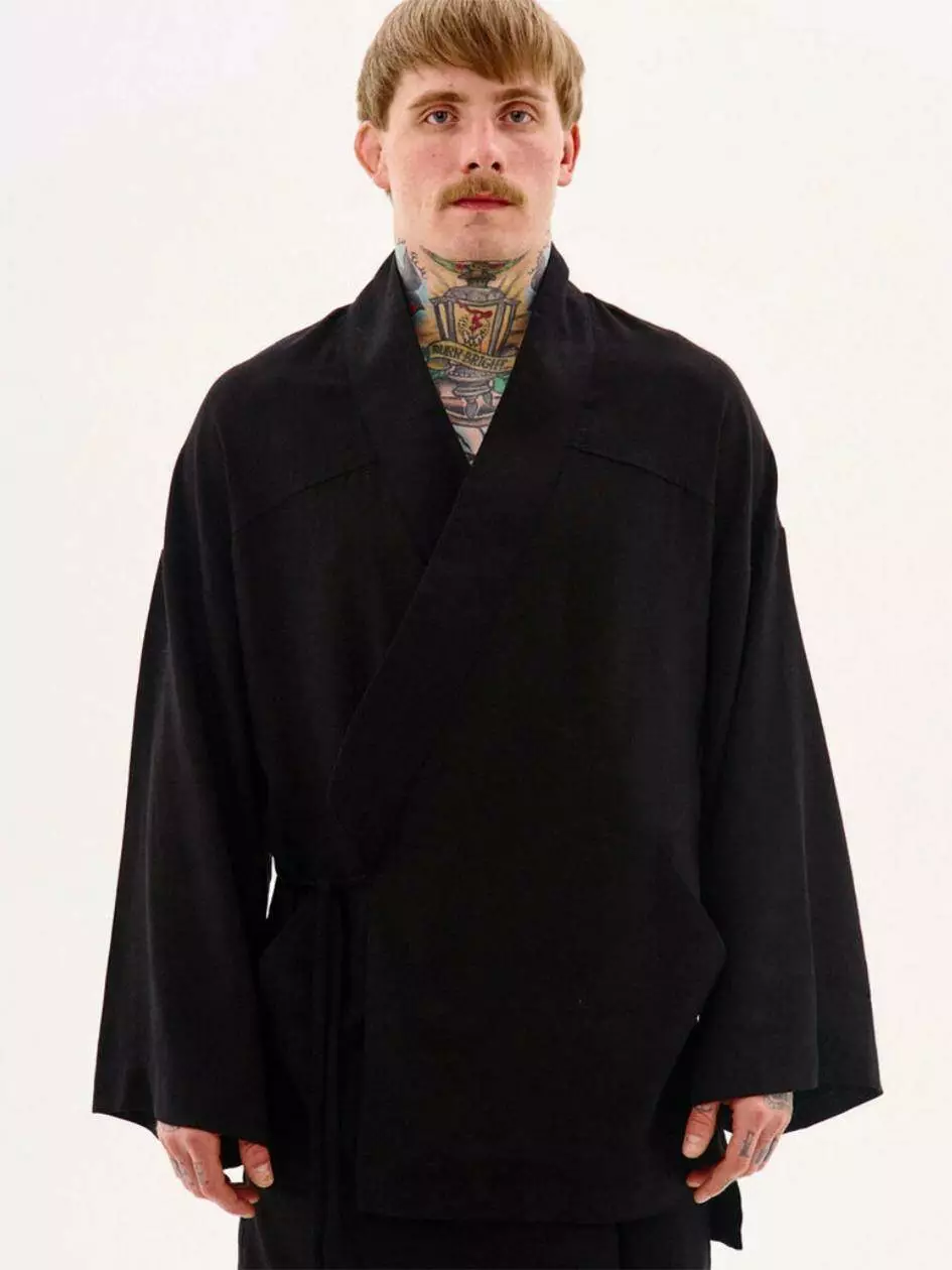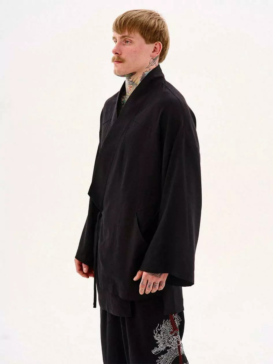 Кімоно оверсайз крою з льону, фіксується на запах з ременем. Має
