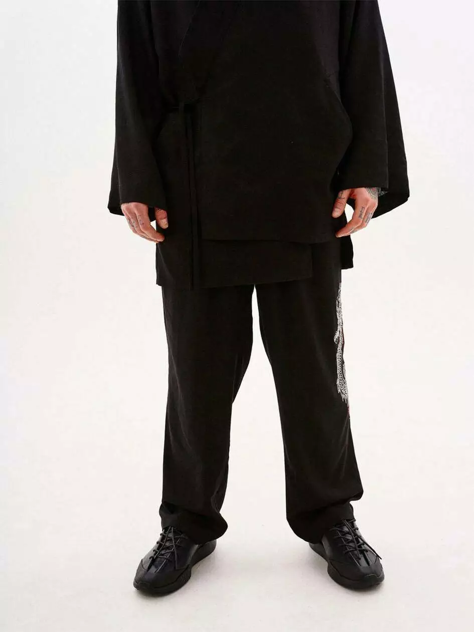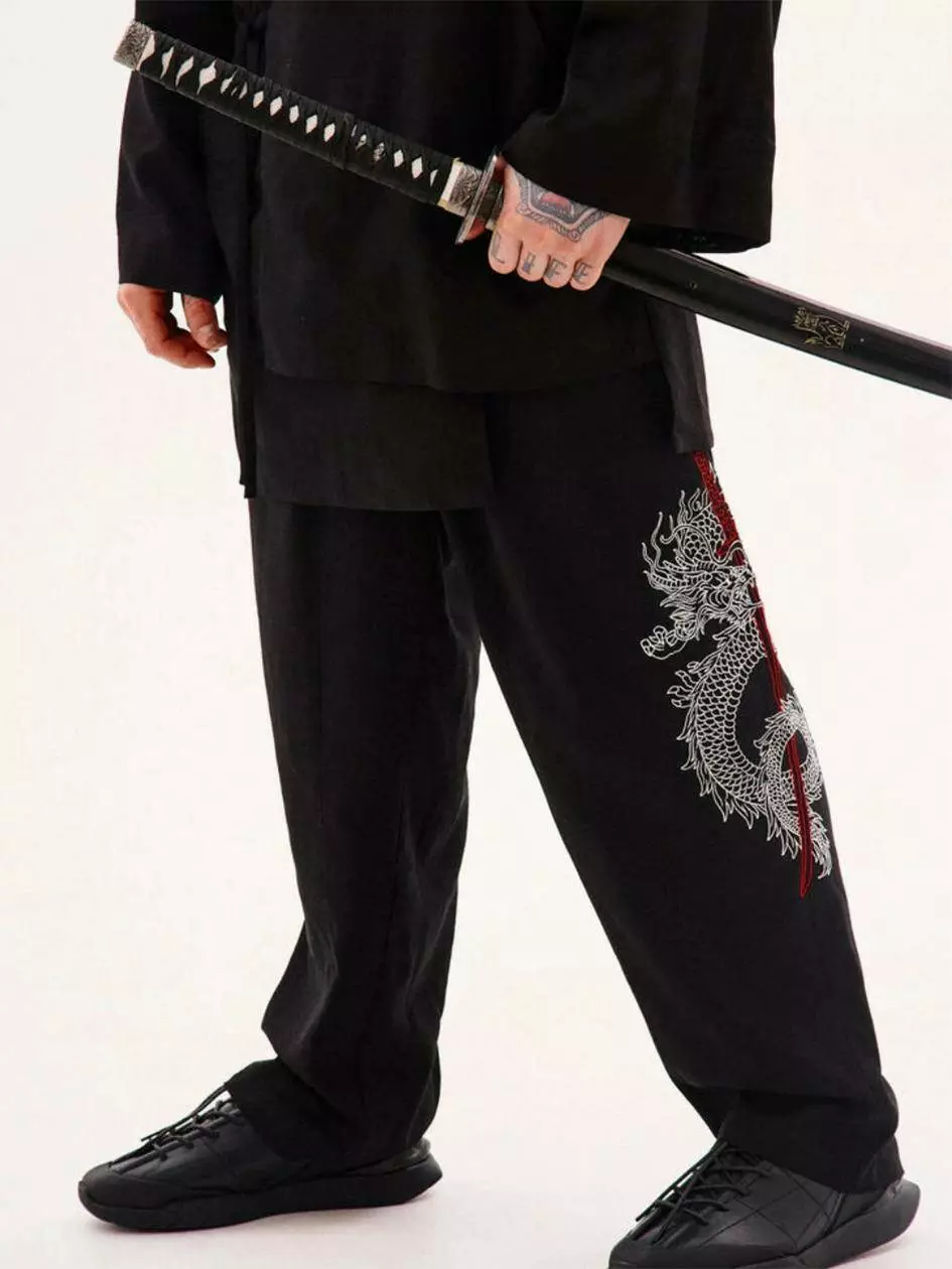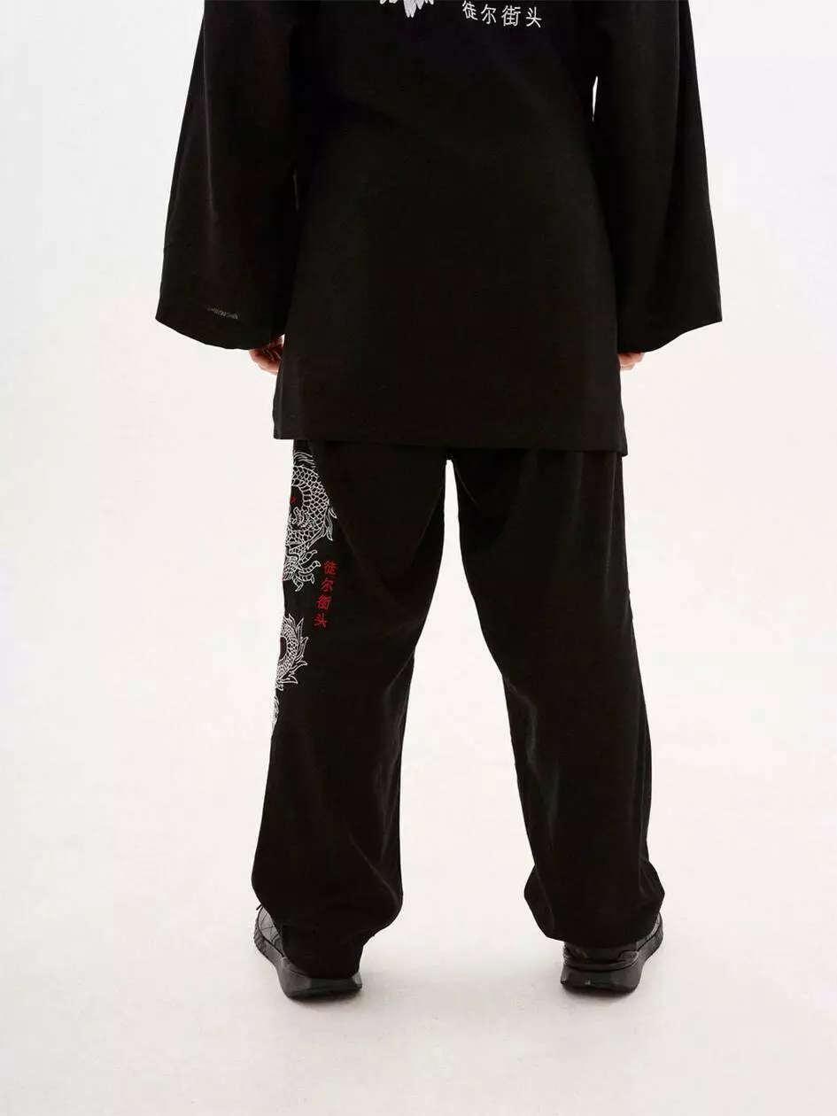 На лівій штанині принт в японському стилі. Дві верхні косі кишені,