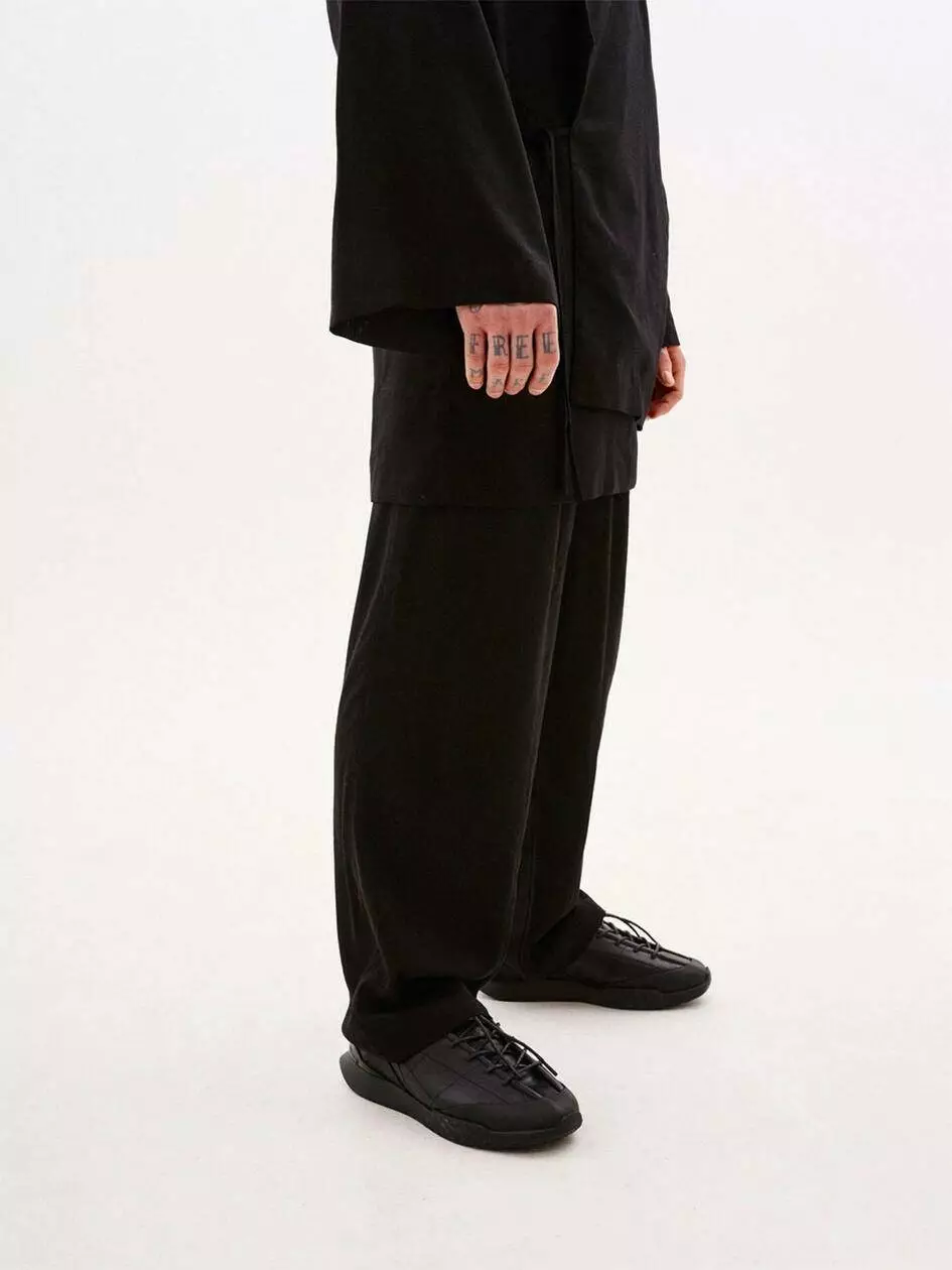 Широкі брюки з льону, з регульованим поясом на шнурку та резинкою.