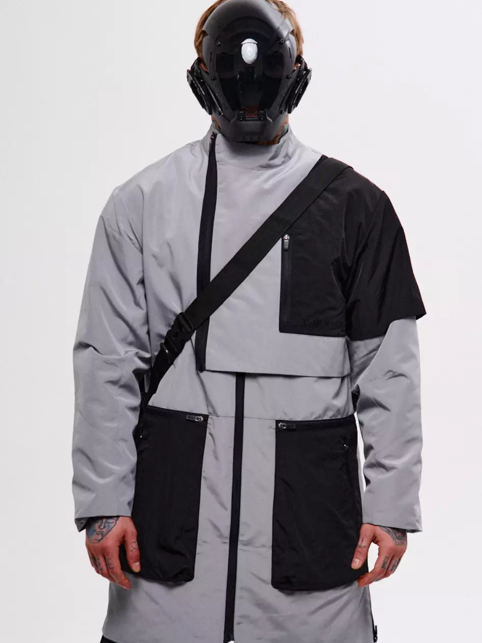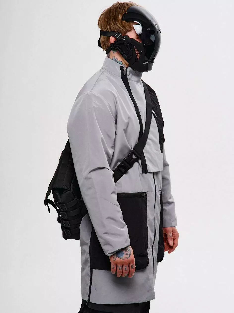 Плащ вільного крою з коміром-стійкою. Подвійна блискавка: одна зміщена, інша — по центру. Зовнішня кишеня на відлітній частині та внутрішня — обидві на блискавці. Складний крій рукавів із фактурною накладкою на лівому. Дві об’ємні подвійні кишені з жатки: верхній вхід — на блискавці з флісовими карманками, боковий — прорізний. У бокових швах — блискавки для зручного доступу до кишень штанів. Виріб утеплений мікрофлісом.
