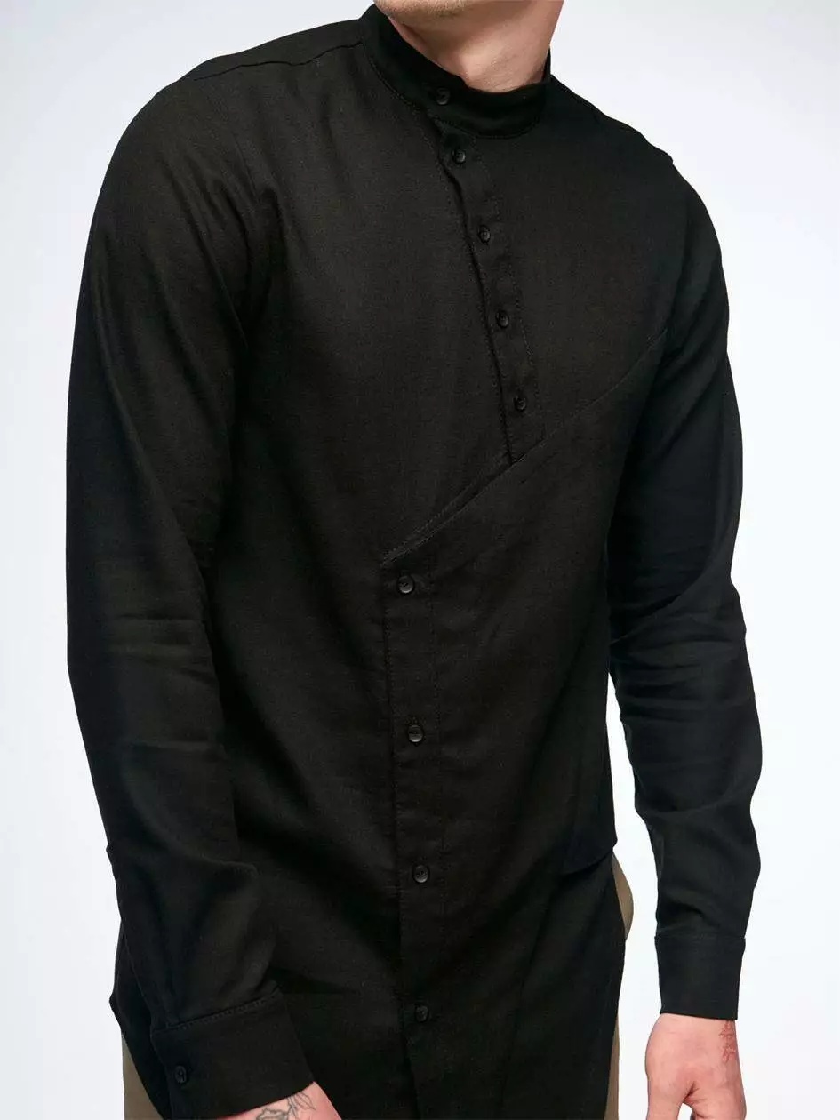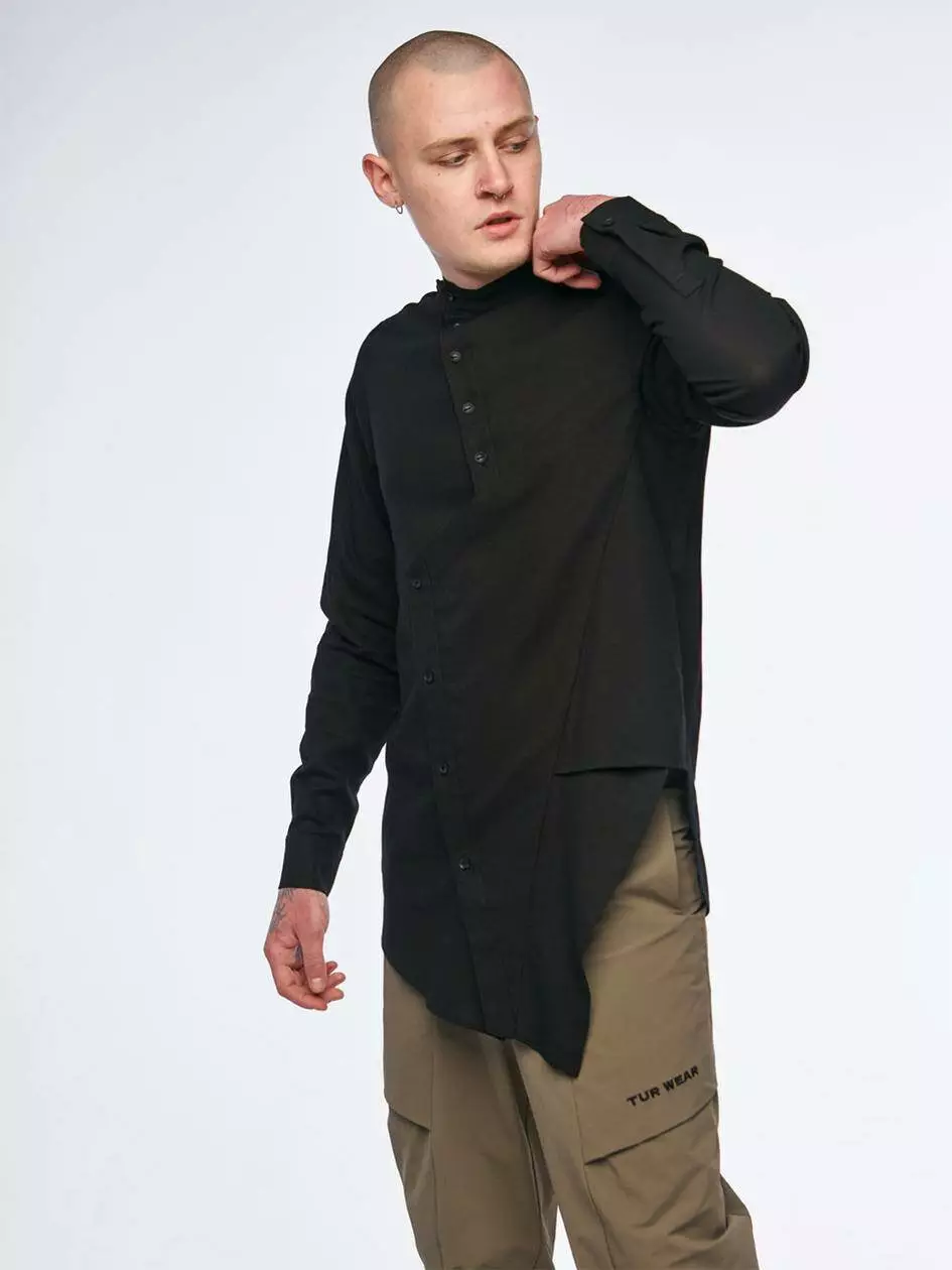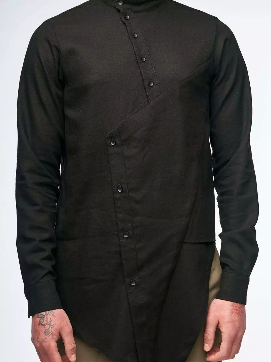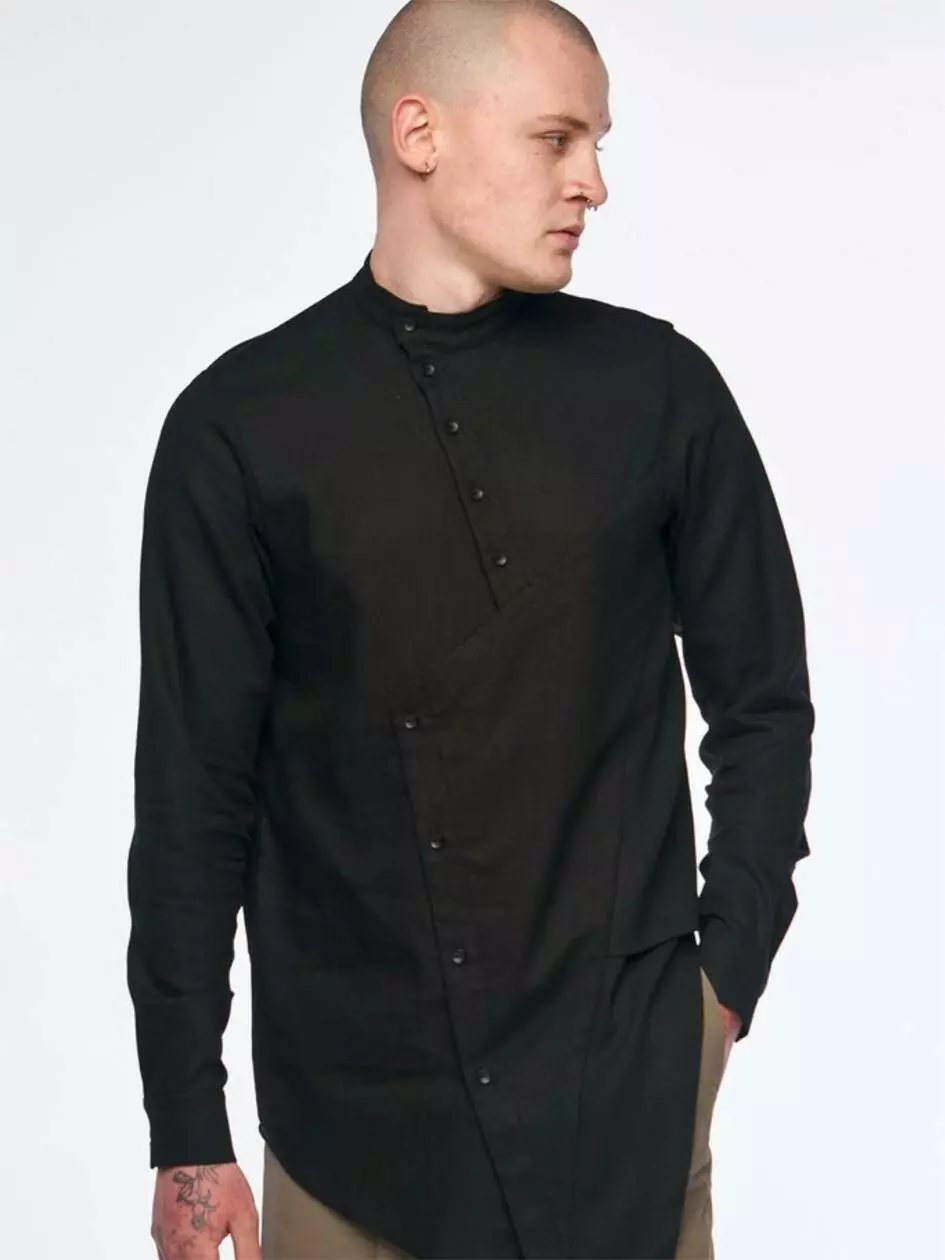 Бавовняно-лляна сорочка асиметричного крою з коміром-стійкою та довгими рукавами — ідеальний елемент для стильного образу. Застібається на ґудзики спереду та на манжетах, що забезпечує зручність одягання та регулювання посадки.
