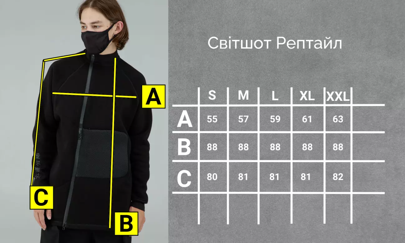 блискавках: збоку та зверху. Рукави завершуються еластичними