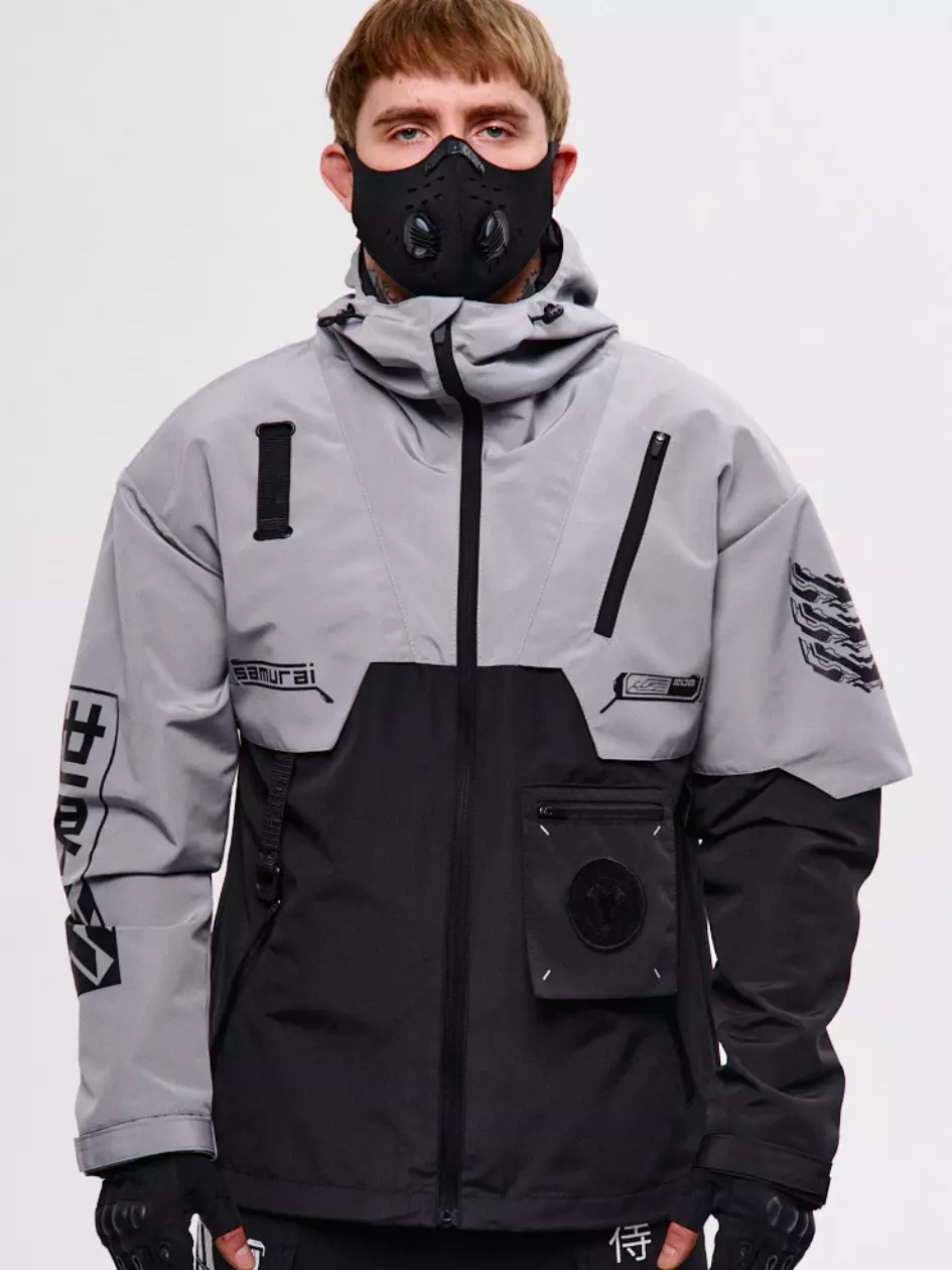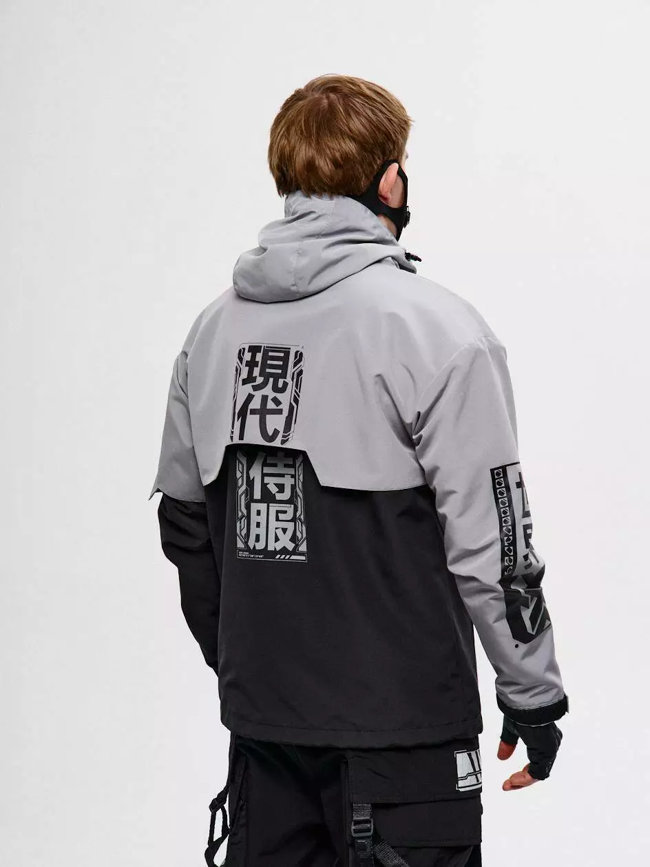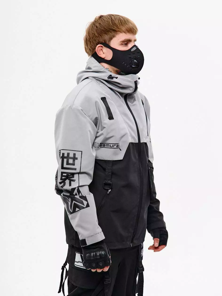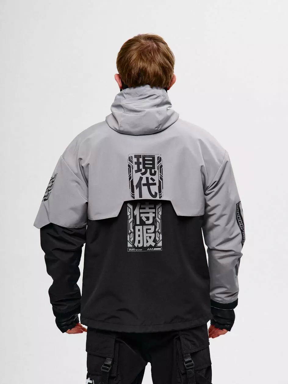 Вітрівка базового крою з глибоким капюшоном, що регулюється по вертикалі. Має накладні деталі на рукаві та грудях, зліва — кишеня на блискавці. Справа — напівприхована стропа з напівкільцем для кріплення брелоків або підсумків; за замовчуванням на ній закріплена фірмова стропа-брелок. Дві нижні кишені на блискавці, знизу — регулювання еластичним шнуром. На лівій пілочці — відлітна кишеня з блискавкою, принтом і велкро-панеллю під патч. Манжети — на липучках з патами. Внутрішнє оздоблення — м’яка тканина та сітка для вентиляції. Дві внутрішні кишені на блискавці. Всього — 7 принтів у стилі кіберпанк. Основний матеріал — щільна, мʼяка на дотик плащівка.