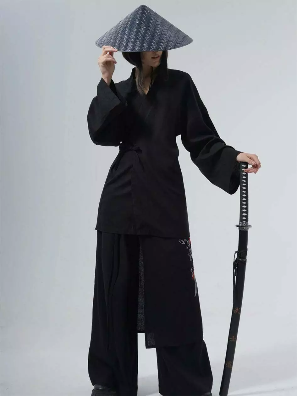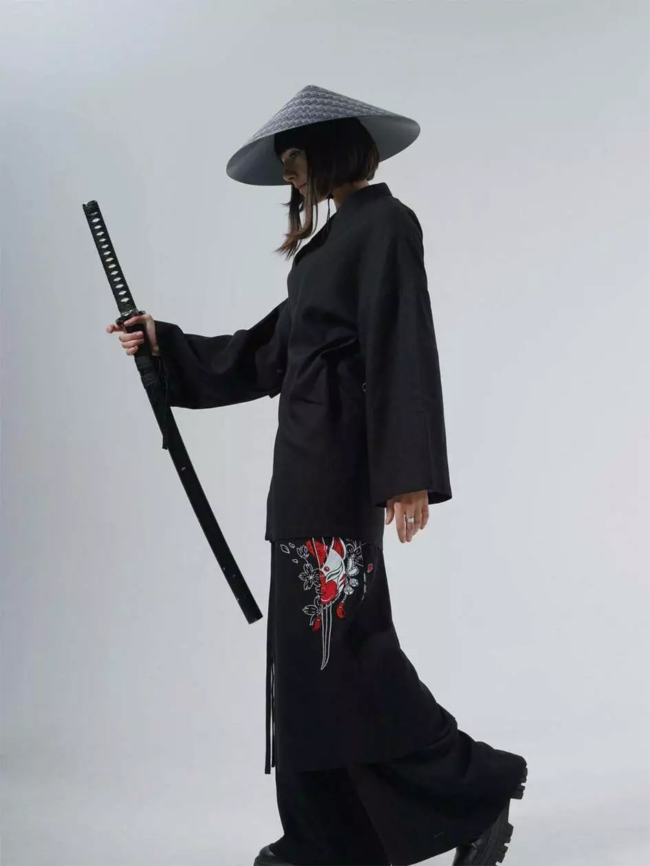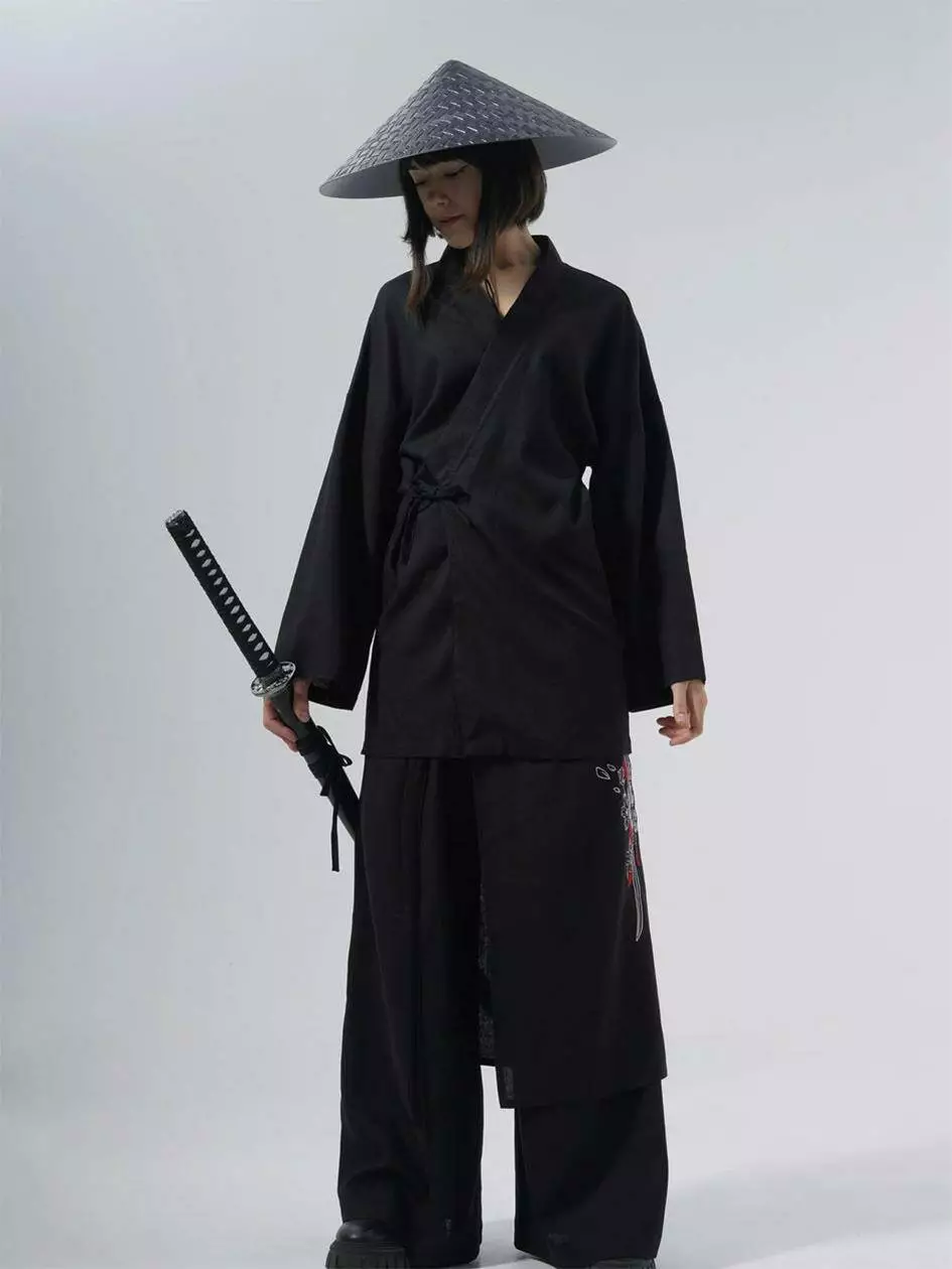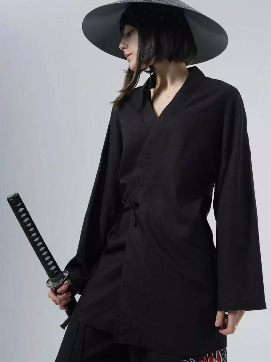 Кімоно оверсайз крою, виконане з льону, зав'язується за допомогою льняних зав'язок і зроблено на запах. На спині розміщується вишивка в японському стилі. Має довгий широкий рукав. Ідеально поєднується з брюками Кадзукі.