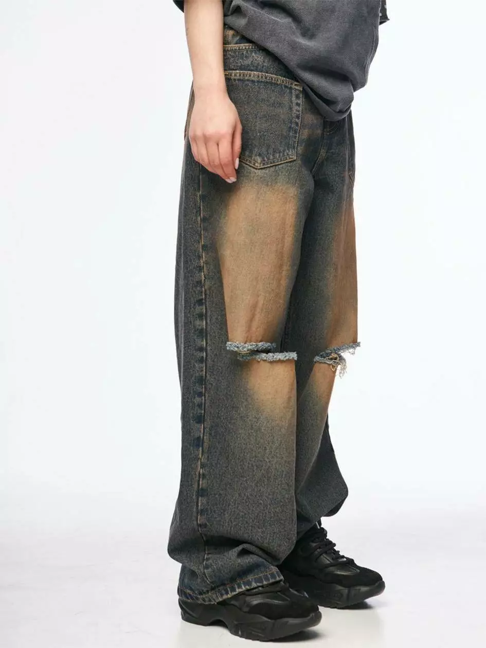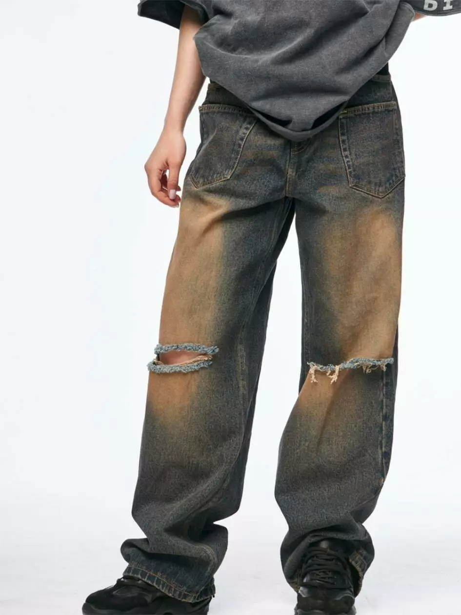 Варені мішкуваті джинси з ефектом потертостей і розривів на
