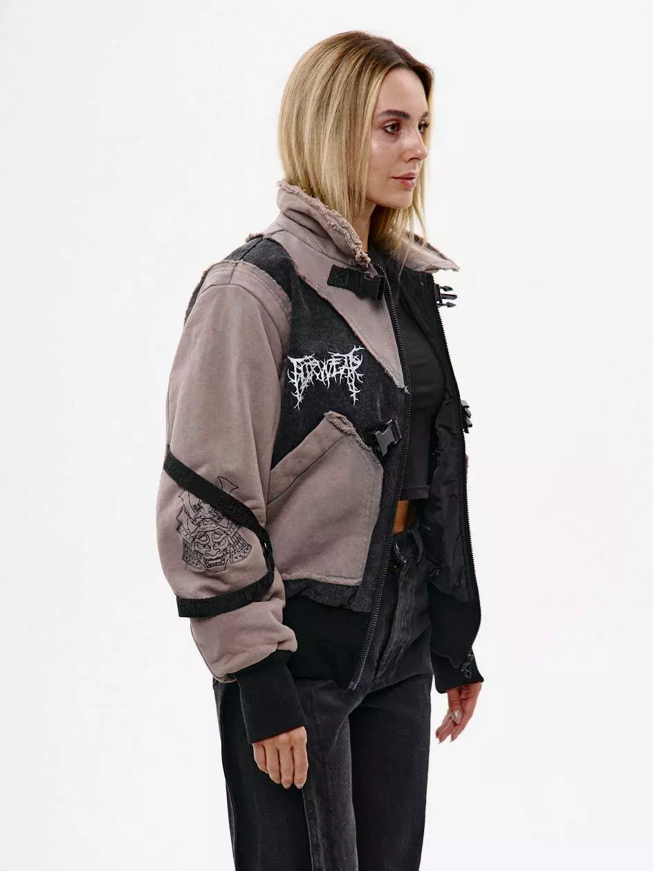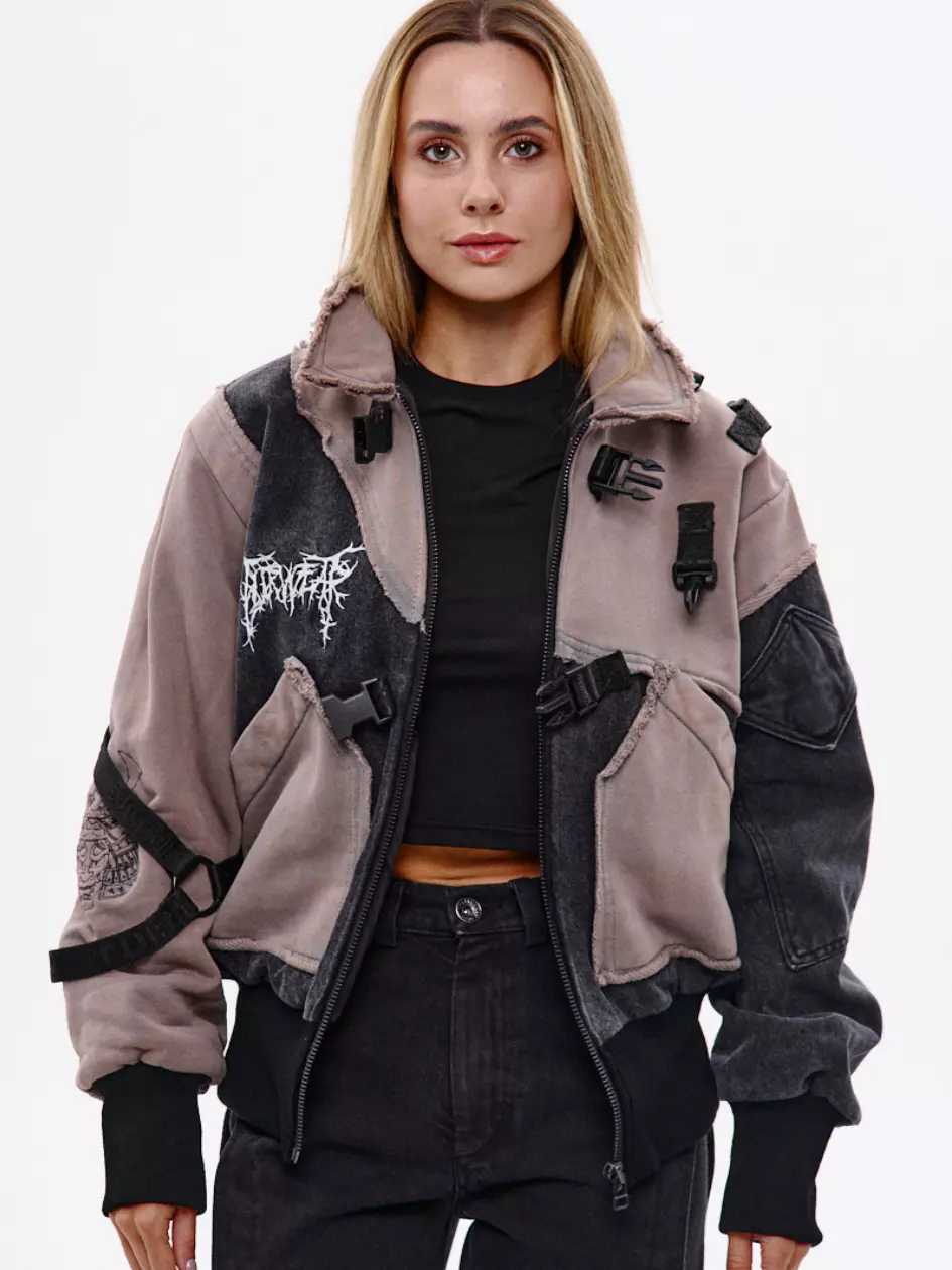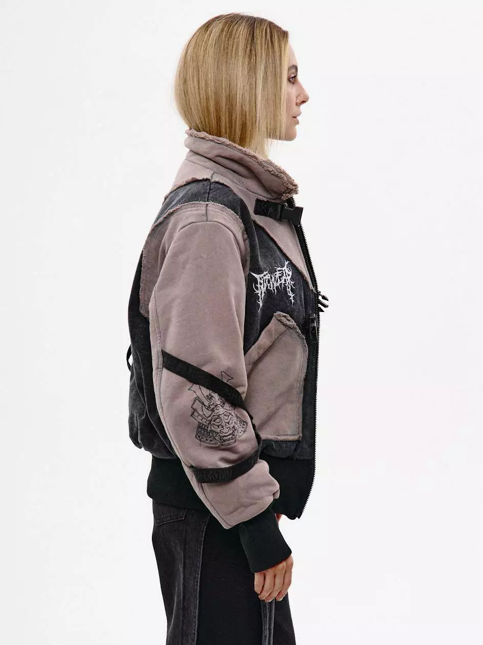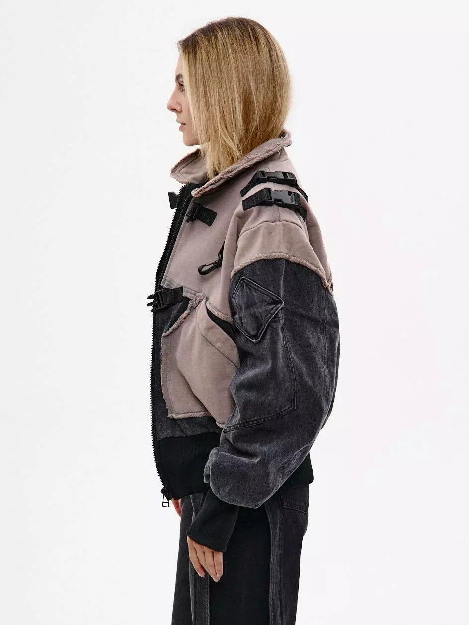 Варений бомбер довжиною по пояс з комбінованих тканин: джинси та котону. Рукава та нижній край оброблені кашкорсе. Дві великі накладні кишені спереду, одна на рукаві, потаємна кишеня всередені. Три вишивки на виробі: попереду, на правому рукаві та на спині. В якості декору є стропи з фастексами. Комфортний для носіння до 0 градусів