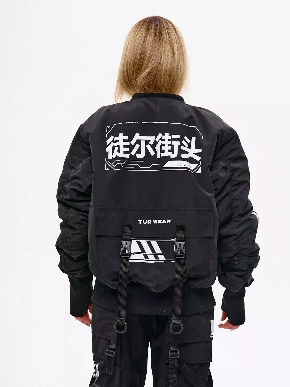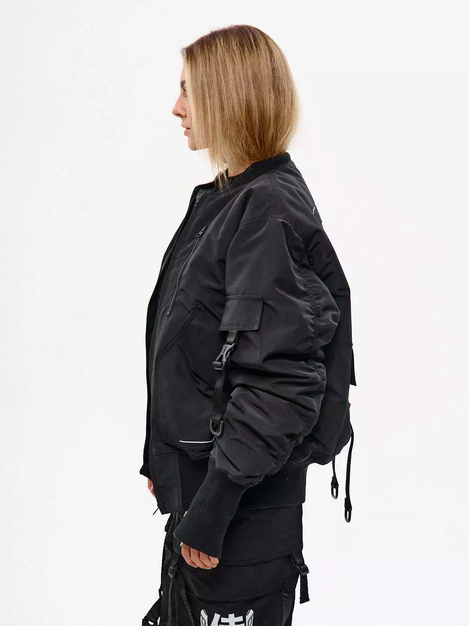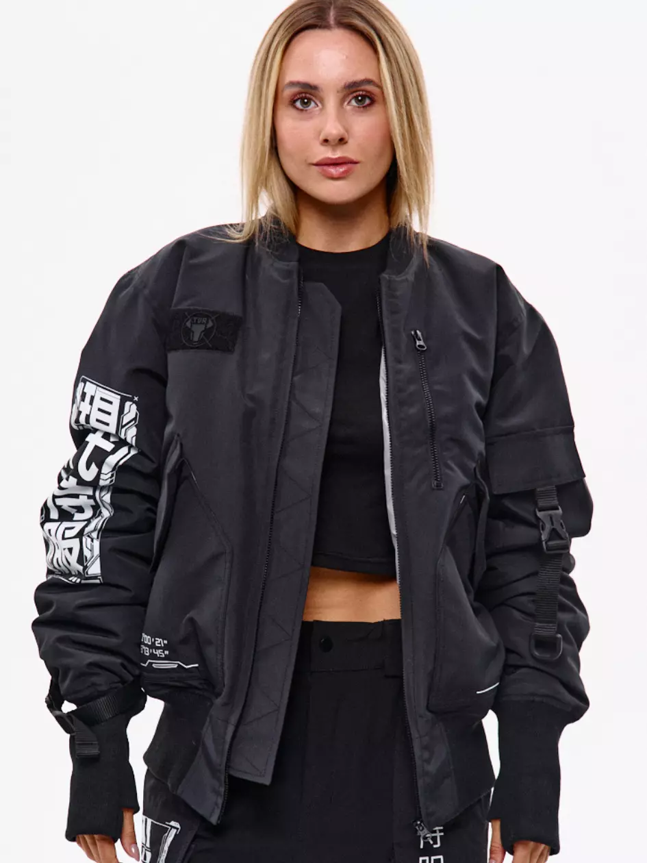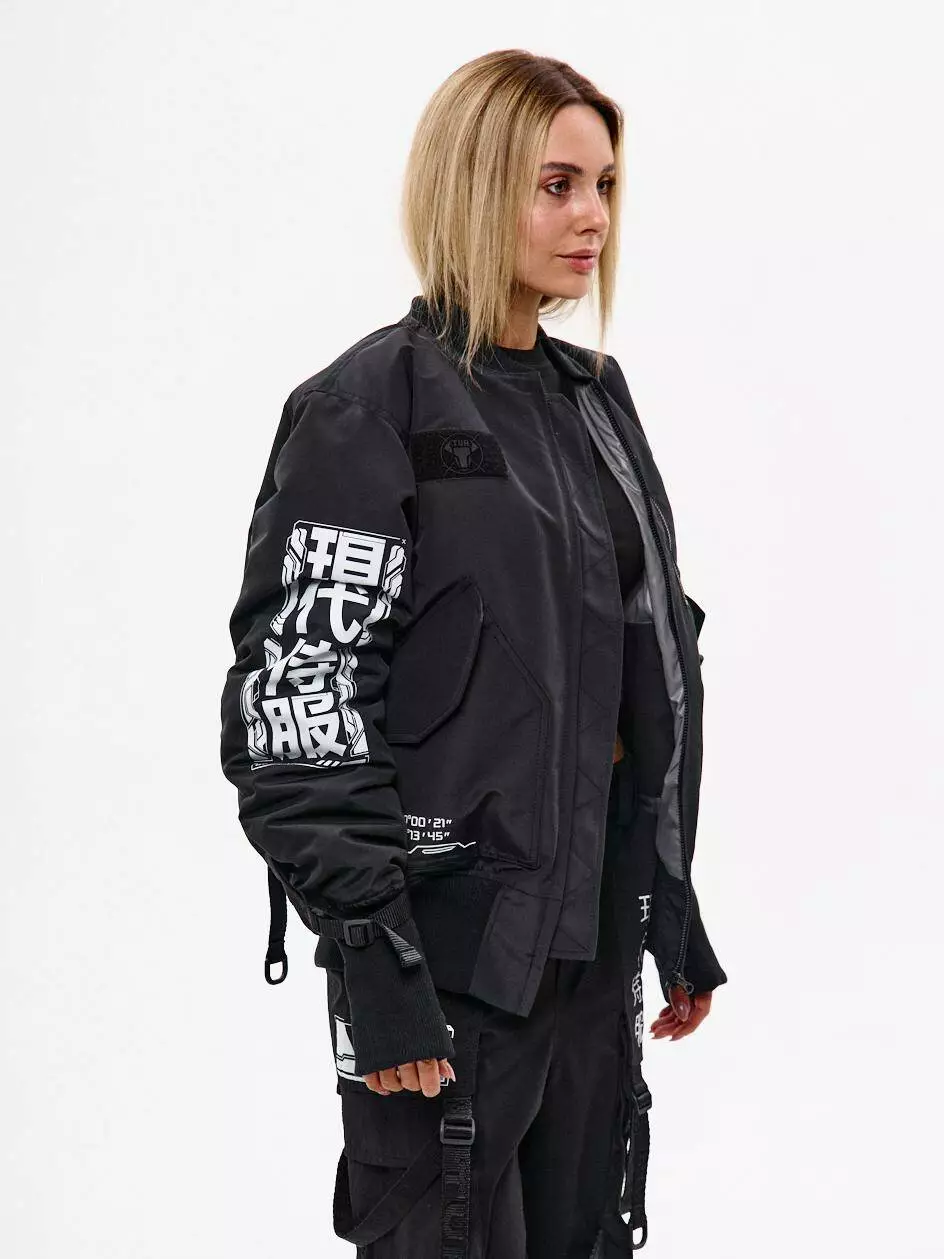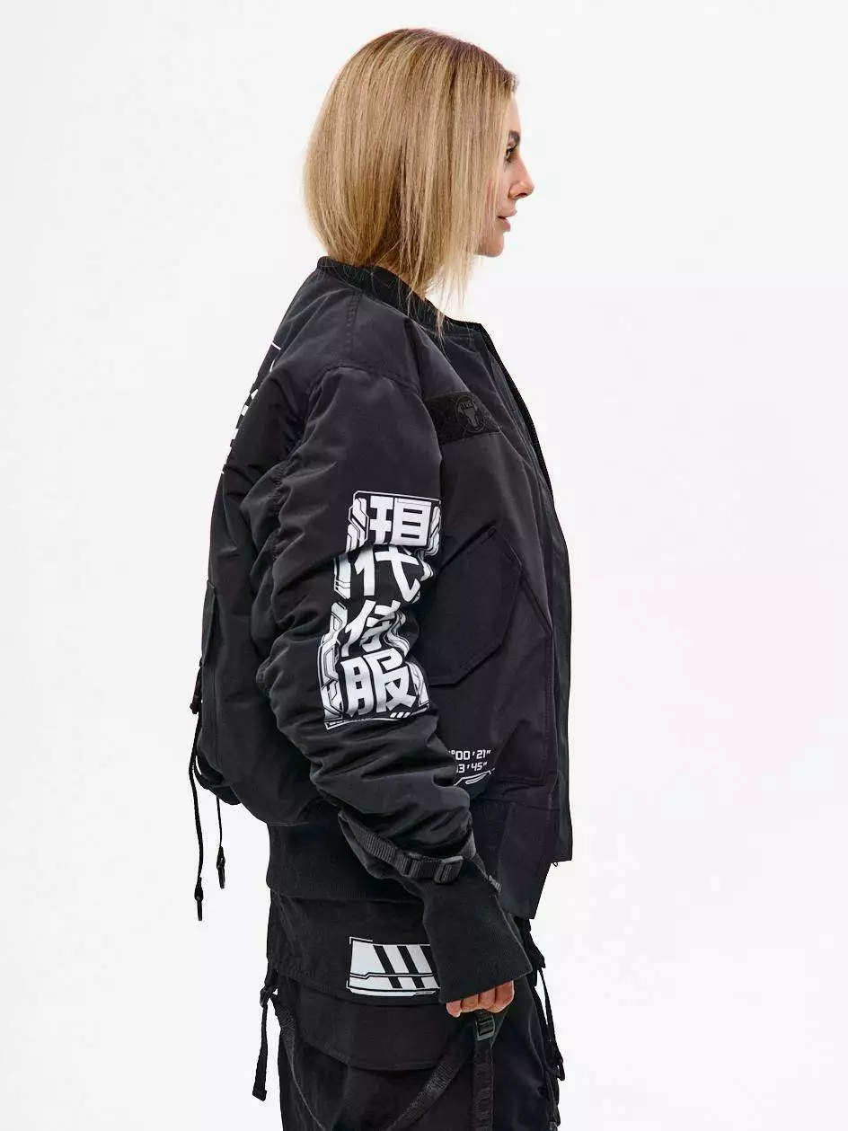 Бомбер у стилі кіберпанк, створений на основі класичної посадки куртки Alpha Industries. Зліва на грудях — кишеня на блискавці, на лівому рукаві — кишеня з клапаном і фастексом. Дві накладні кишені з клапанами, як у культовому бомбері Альфа. Має 6 принтів по всьому виробу сірого кольору.